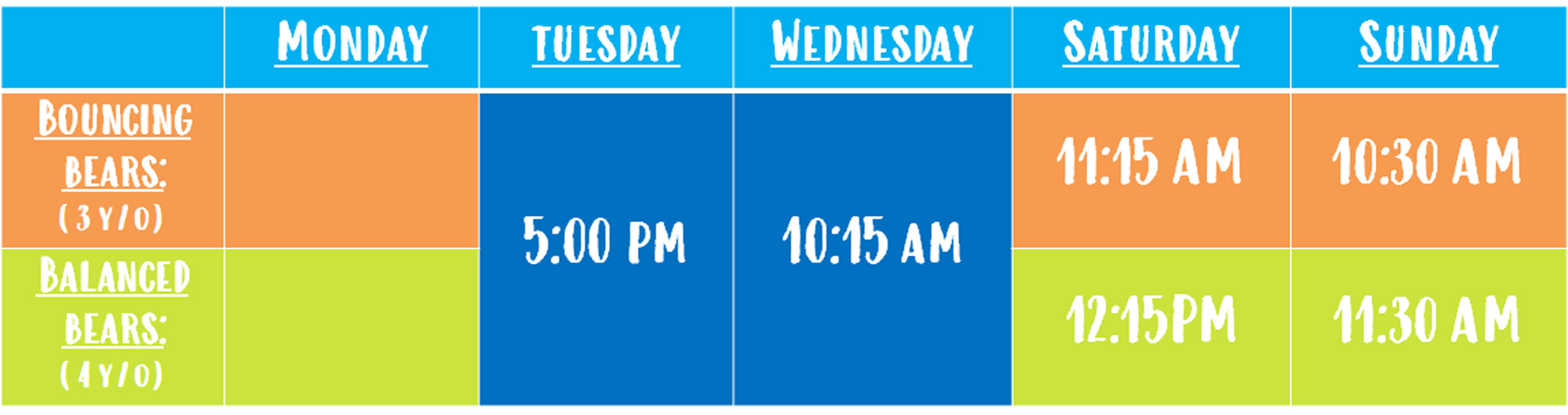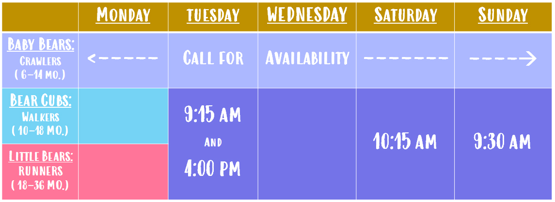Now offering weekday and weekend classes! All classes are 45 minutes long and run on an ongoing monthly basis.
